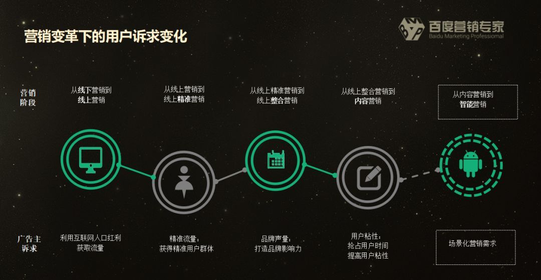 随着互联网营销的变化,用户诉求从最初的时候线下转到线上营销,抓住了互联网人口红利期,随着时间的推移,从线上营销到线上精准营销,重点就是要抓精准流量。精准营销延伸到整合营销,到内容营销。乃至当前AI等技术的发展,在场景化需求的基础之上,用户行为到底呈现的特质,全面深入了解的基础上有效传递我们产品价值和达成交易成单。
