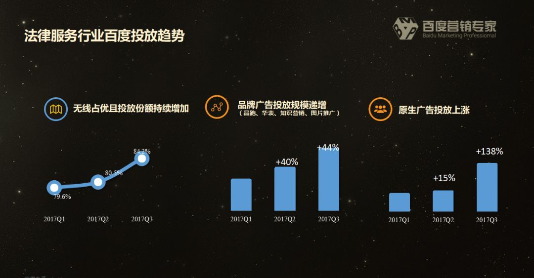 法律服务行业在全媒体的投放,网络媒体的份额居高,广告主在百度平台投放有三个特点:无线、品牌、原生广告投放呈现增势。